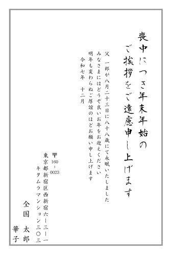 新年のご挨拶にかえて 祖母〇〇が九月に九十五歳で永眠いたしました 新年のご挨拶は失礼させていただきますが 年賀状がないお正月は寂しさが募ります 皆様からの年賀状は 通年通り楽しみにしております 寒さ厳しい折 どうぞお身体をご自愛くださいませ 令和○○年十二月 差出人名前・住所・電話番号 |